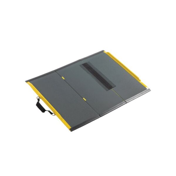 Ideaal om altijd bij je te hebben, in de auto of in de optionele draagtas achter op je rolstoel. Gemaakt van koolstofvezel en is daardoor licht, compact en dus makkelijk te hanteren. Verkrijgbaar in verschillende afmetingen. Getoond exemplaar weegt slechts 3,5kg, is 80cm breed en 72cm lang. Belastbaar tot maar liefst 300kg. In drie delen op te vouwen tot slechts 72 x 36,5 x 4cm.