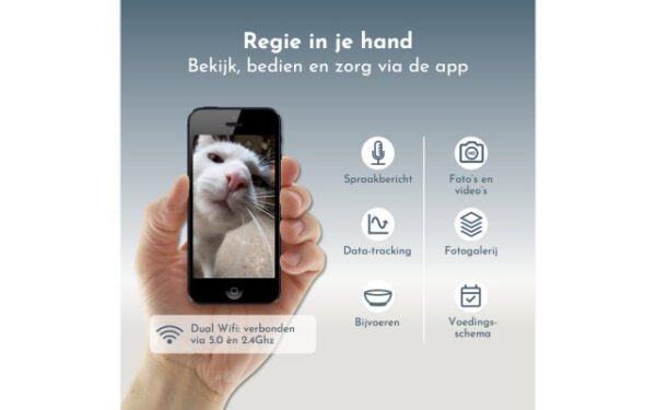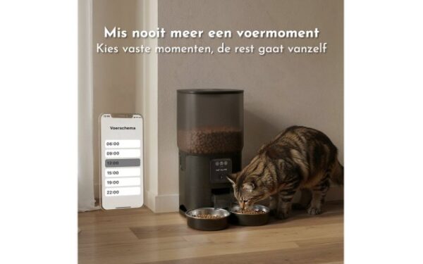 Met de automatische voerbak geniet je van volledige vrijheid en hoef je je geen zorgen meer te maken over de voedertijden van je katten. Dankzij een voerschema dat je volledig naar wens kunt instellen, krijgen je katten altijd op tijd de juiste portie. Zo kun je zonder zorgen spontaan ergens heen of onverwachts dineren met vrienden. Daarnaast zit de automatische voerbak boordevol handige functies. Met de ingebouwde camera kun je live meekijken, foto’s maken en een voicebericht sturen om contact te houden met je katten, waar je ook bent.