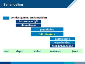 De behandeling ervan gebeurt door het afweersysteem te remmen (afweeronderdrukkende medicatie), of door de spier te versterken (symptomatische medicatie).