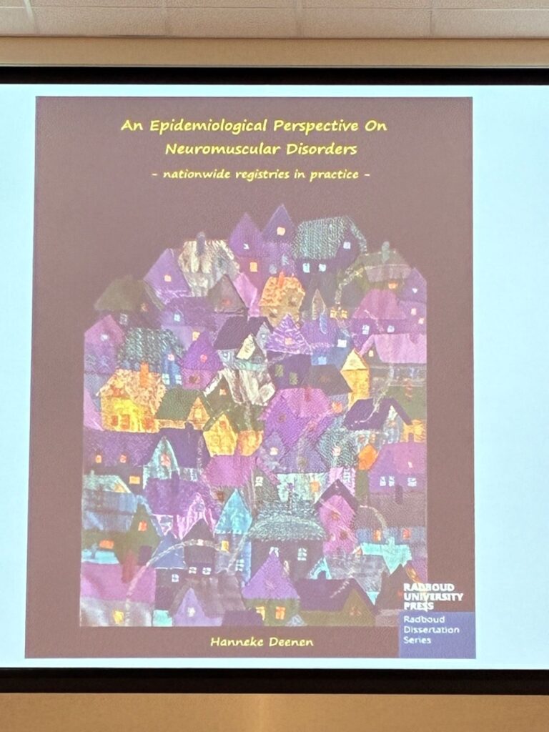 De titel van Hannekes proefschrift luidt ‘“An Epidemiological Perspective On Neuromuscular Disorders: nationwide registries in practice’. Als werkgroep hebben we veel met Hanneke samengewerkt met onder andere de registratie en onderzoek rondom FSHD en COVID-19. Ook maakte zij zich hard om vervroegd vaccineren via de registratie mogelijk te maken.