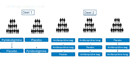 In het eerste deel van het onderzoek kregen de deelnemers aan het onderzoek gedurende een week alleen pyridostigmine of een placebo (nepmiddel) en de week erna andersom. Noch de patiënt noch de behandelend arts wist wie welk middel kreeg. In de tweede fase van het onderzoek mochten de deelnemers de pyridostigmine weer gebruiken zoals normaal. In dit deel werden er twee verschillende doses van de amifampridine en ook een placebo onderzocht.
