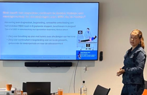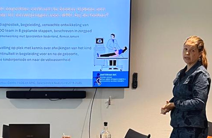 Na Linda van den Berg is het podium voor dr. Nienke Kok, gynaecoloog perinatoloog, en drs. Femke Stoelinga, kinderrevalidatiearts, beiden in het Amsterdam UMC. Zij vertellen over de resultaten het internationaal onderzoek: AMC en zwangerschap. Het onderzoek is, en wordt, uitgevoerd onder de bezielende leiding van prof. Hanneke de Vries, medisch adviseur van de AMC diagnosegroep en helaas door ziekte niet aanwezig op de Spierziektedag. In het onderzoek is onderzocht of moeders tijdens hun zwangerschap verminderde kindsbewegingen ervaarden en in welke mate dit een voorspellende waarde heeft of de baby arthrogryposis heeft, en in welke mate het kleine lijfje aangedaan is.