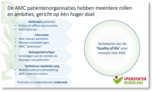 Remco Jansen, voorzitter van de diagnosegroep AMC van Spierziekten Nederland, heet iedereen welkom en begint met een korte toelichting op de agenda van de dag. Hij vertelt iets meer over de organisatie, de ambities en de resultaten van de diagnosegroep AMC, zoals het stimuleren en ondersteunen van de oprichting van de multidisciplinaire expertise centra voor AMC in het Erasmus MC en in het Amsterdam UMC.