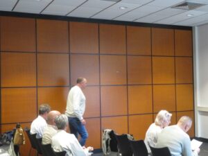 Toen iedereen na de tests weer wat tot rust gekomen was, kon Johan de bijeenkomst officieel openen. “Het is raar dat ik dat moet doen. We waren erop voorbereid dat we uitgebreid aandacht zouden geven aan ons jubileum als oudste diagnosewerkgroep binnen Spierziekten Nederland, maar nu moeten we stilstaan bij het plotselinge overlijden van Betty Prins, onze voorzitter. We zullen haar missen!”