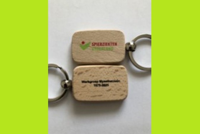 Als ik tegen 10.30 uur aankom, staat het eerste parkeerterrein al vol met de auto’s van de mensen die de eerste diagnoseprogramma’s aan het volgen zijn. En als ik vervolgens de Athenezaal van Hotel Papendal binnenloop, is Els al druk bezig om de vroege bezoekers van het myasthenie-programma welkom te heten. Els is voormalig werkgroeplid, ze weet dus nog goed hoe dat moet. Iedereen krijgt een polsbandje en een sleutelhanger, die we hebben laten maken ter gelegenheid van het 50-jarig bestaan van de werkgroep.
