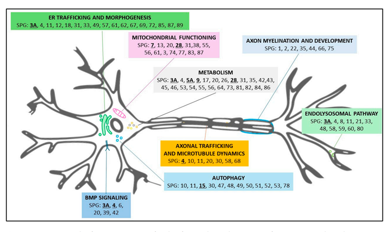 Hieronder een plaatje waar het bij HSP allemaal mis kan gaan in de zenuwcel.
