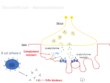 Deze nieuwe medicijnen werken op het complementsysteem. Antistoffen bij myasthenia gravis kunnen voor extra schade zorgen door het activeren van complement. Dit is een reeks eiwitten vanuit het afweersysteem, bedoeld om bacteriën en virussen op te sporen en beschadigde cellen op te ruimen. Door het remmen van complement met medicijnen wordt extra schade op de zenuw-spierovergang voorkomen.