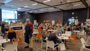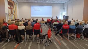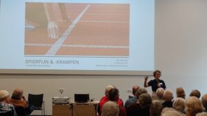 Foto van bezoekers van de Spierziektedag 2025, die luisteren naar een presentatie