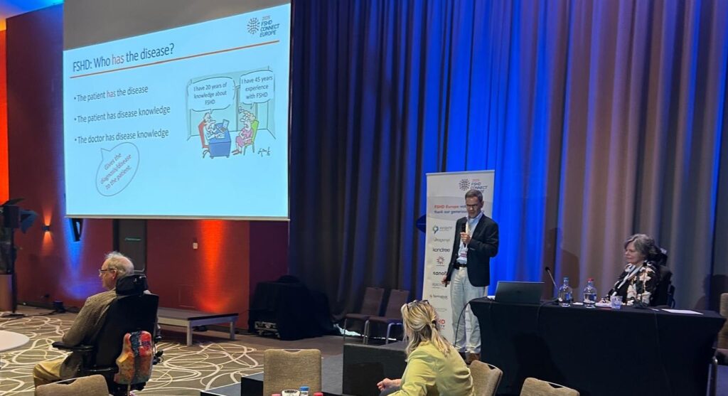 Baziel maakte een inleiding en stelde de vraag of de ziekte van de arts of van de patiënt is? De zaal antwoordde van de patiënt. Waarom de vraag? Een patiënt is niet alleen FSHD/ziek, hij/zij is een persoon die een ziekte FSHD heeft maar naast de ziekte ook een leven leidt en dit zo goed mogelijk invult met beperkingen. Na de uitleg van Baziel bespraken Almer en Joyce hoe ze hun leven leiden. Welke uitdagingen ervaren ze, hoe sturen ze bij en hoe voorkomen ze dat ze vastlopen?